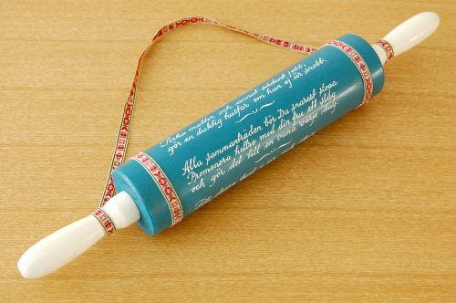 スウェーデンで見つけた、カントリーテイストの何とも可愛らしいめん棒です!スウェーデン語の文字が書かれています。