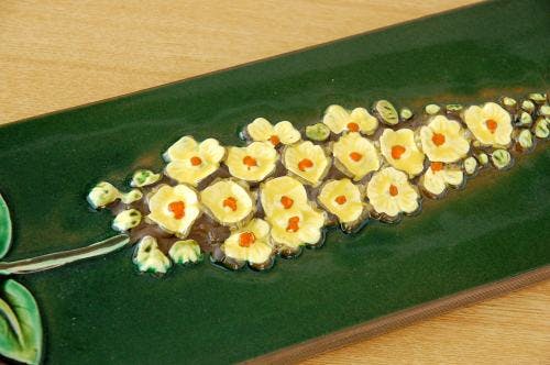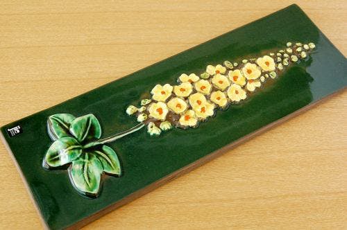 こちらの陶板もまた素敵です!どっしりとした素朴な陶器の質感の上に浮かび上がる黄色いお花。可憐さと凛とした強さの両方の印象をうけます。