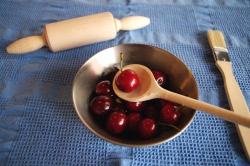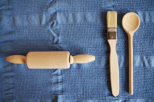 パンやクッキー生地をのばすためのめん棒と、卵黄などをぬるための刷毛(はけ)、そして小麦粉やトッピングのナッツなどをすくうためのおさじのセットです。