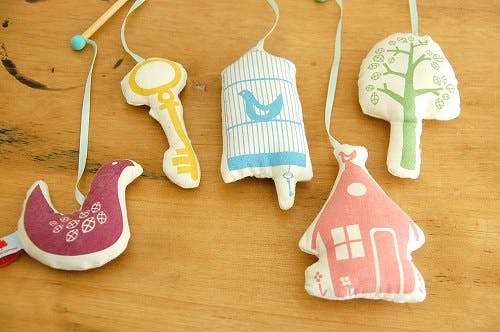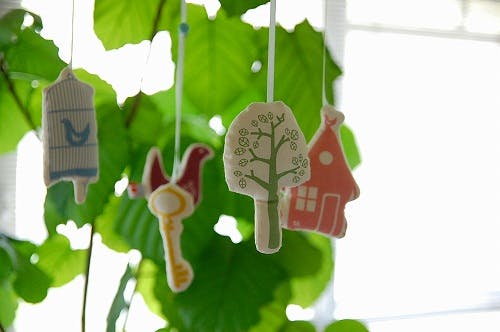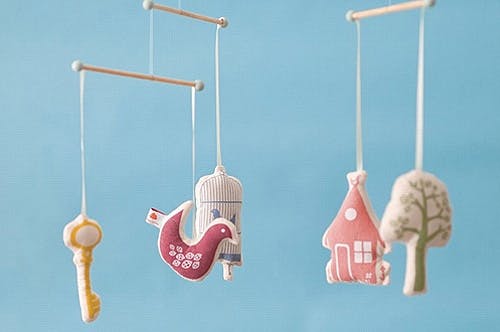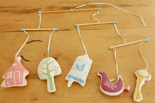 5つのモチーフがゆらゆら揺れるこのモビールは、