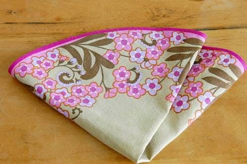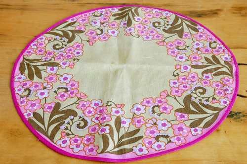 濃いピンクの縁取り、優しいベージュの布地の上に浮かぶ薄紫色や淡いピンク色の丸っこいお花模様。