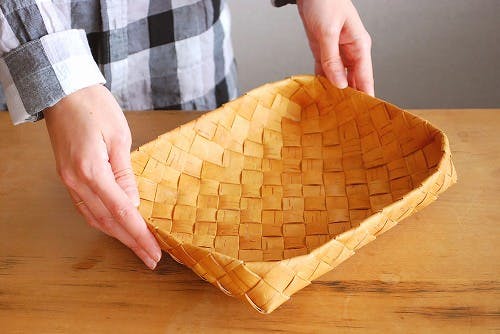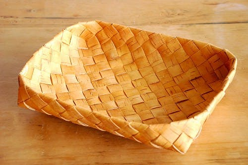 白樺の樹皮をなめして作られた材料で丁寧に編まれたブレッドバスケットです。