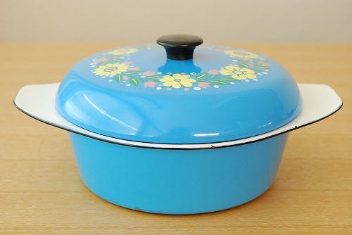 コクムス社のお鍋の中でも人気の高いデコレーションのシリーズです。それもそのはず、爽やかな空色をベースにして、蓋の部分にはお花畑のような可愛い模様。人気が高いことにも素直に頷けます。