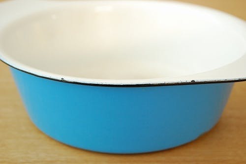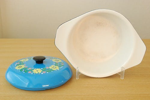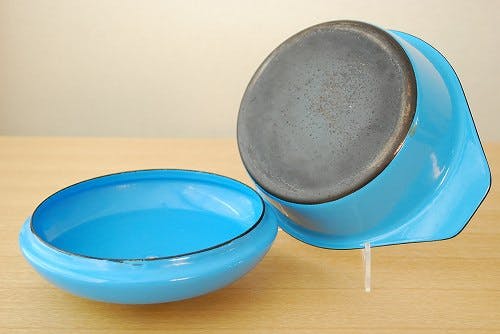 状態としては内部底面に若干の使用感があるのと、開口部縁に極小のホーロー落ち、側面底部に小さなシミが見られます。どれもほとんど気にならない程度のものですし、ヴィンテージ品としては概ね良好なコンディションですので、これからも長く調理道具として活躍してくれることと思います。
