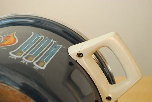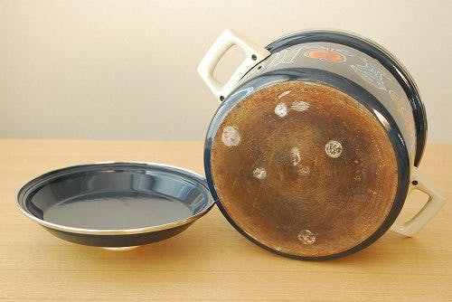 コンディションとしては鍋底内部と裏面に使用感があるのとまた持ち手の片方にヒビが見られます。どれもご使用には問題ないものですが、ある程度価格を考慮してご紹介させていただきます。
