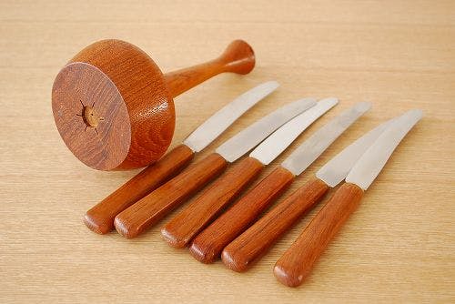 スウェーデンで見つけた、リンゴの形が可愛いチーク材のカトラリー(ぺティナイフ)セットです。