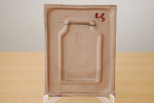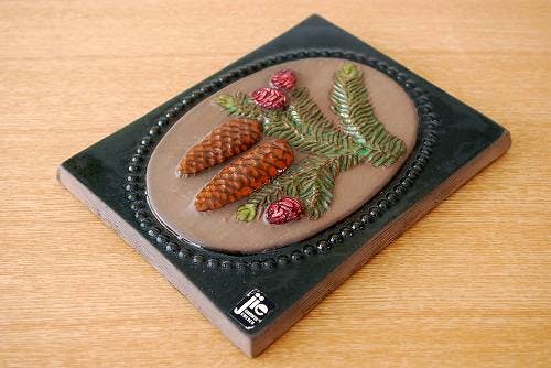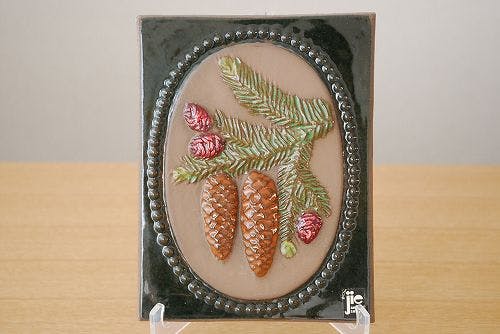 こちらの陶板は、松の木に実ったまつぼっくりが描かれ、その周りが額縁の様に装飾されています。自然の中からすてきな一場面を切り取る手法はJIEならではですね。