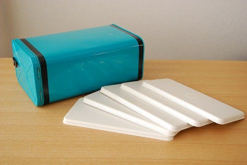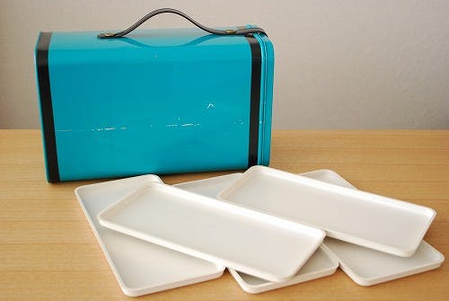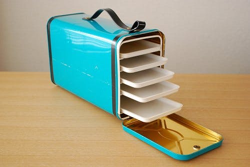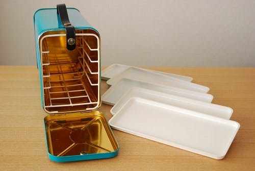 内部には数段設けられていて白いプラスティックトレーを引き出せる仕組みになっています。普段の暮らしの中でお菓子やパンなどを収納してお使いいただいても可愛いと思いますし、そのままピクニックに持って出かけたくなるようなデザインでもあります。