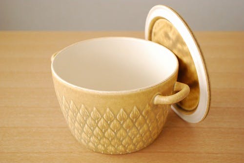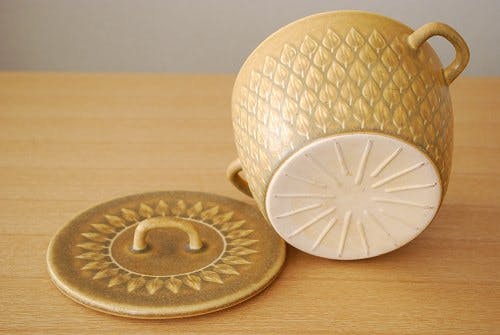 蓋の部分に円形に規則正しく並んだ木の葉がとても印象的なお品です。