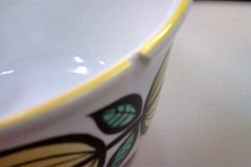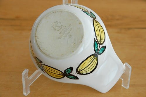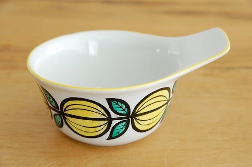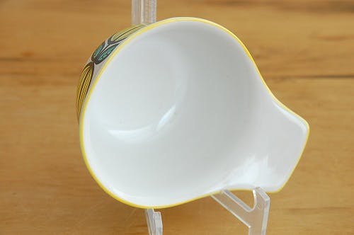 艶のある白地にフルーツと葉の柄がぐるりと描かれています。フチも黄色く塗られていてさわやかな印象ですね。