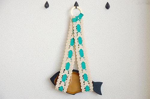 木製の輪っか部分を壁などに固定して、布の輪っかにトレーを引っ掛けるように使います。