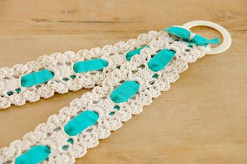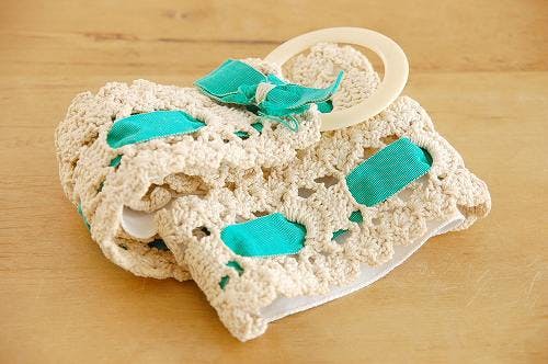 手編み部分に通された緑色のリボンがアクセントになって、やさしい雰囲気が引き締まっていますね。