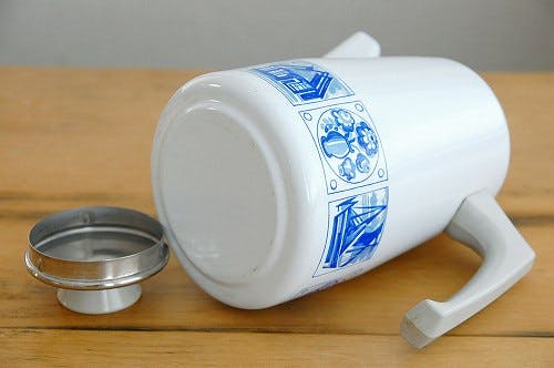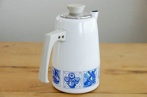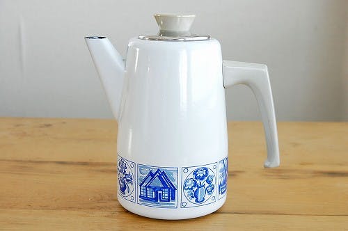 清潔感たっぷりの白地に、家や花瓶の絵が施されていてシンプルで素朴な雰囲気のホーローポットです。