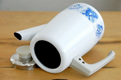 状態としては、注ぎ口の部分に僅かなホーロー落ちと、内部に少々使用感が見られますが、ご使用には問題ない程度かと思います。その他には気になるキズやヒビなどはなく、これからも長くお使いいただけるお品だと思います。