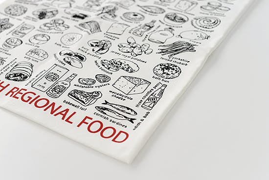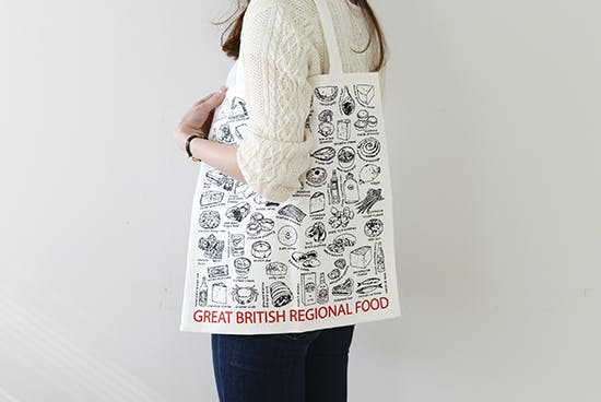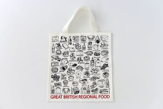 ティータオルの中でも人気の高い、イギリス各地の郷土料理を賑やかに描いた『Regional』の絵柄をショッピングバッグに仕上げています。