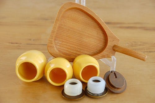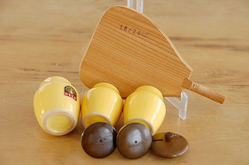 トレーは持ち手が付いており木製、調味料ポットは陶器で蓋のみ木製となります。