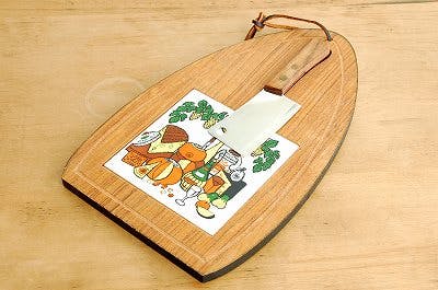ボード本体は木製、チーズなどをカットする部分にはタイルがはめ込まれていて、タイルに描かれているイラストも楽しいものです。
