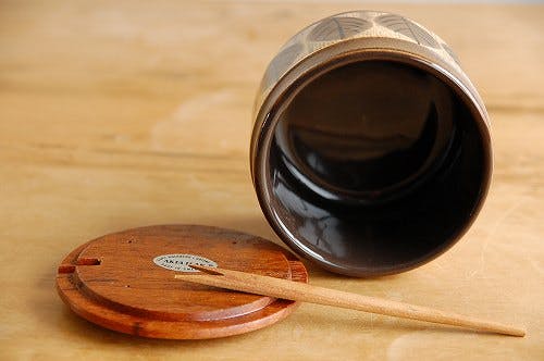 スウェーデンで見つけた葉っぱ模様の陶器のキャニスター(木蓋&フォーク付き)(大)です。嬉しいことにフォークまで付いています!