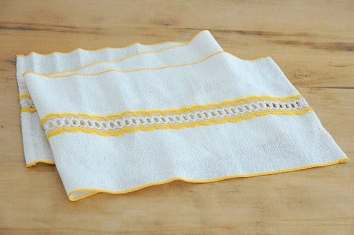 白い布地に黄色の縁取り、そして真ん中にはさーっと黄色と白の模様が入っていて、とても明るい印象のテーブルランナーです。木目調のテーブルにさっとひくと、とっても温かい雰囲気となりそうですね!