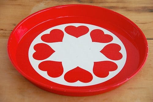 デンマークで見つけたブリキのトレー(ラウンド・赤ハート柄)です。