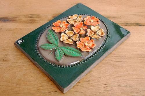 こちらの陶板もまた素敵です!どっしりとした素朴な陶器の質感の上に浮かび上がる可憐なオレンジのお花。本当にかっこよさと可愛らしさを兼ね揃えたJIEらしい作品です。