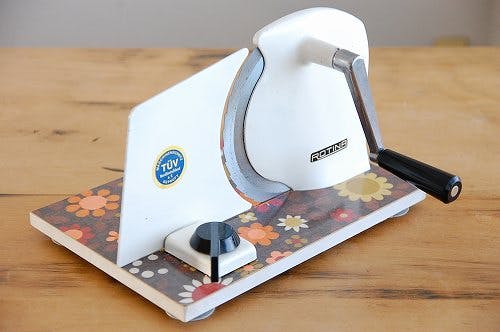 その名のとおり、硬めのパンやコールド類(お肉)などをスライスすることができる面白い道具です。今回入荷したものは、土台の部分がレトロな花柄になっている少し珍しい一品です。