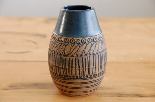 表面に刻まれた象形文字のような個性的な模様と、陶器の土色とブラックの色合いが渋くてかっこいいこの花瓶は、どこか和の空気とも通じるような雰囲気です。
