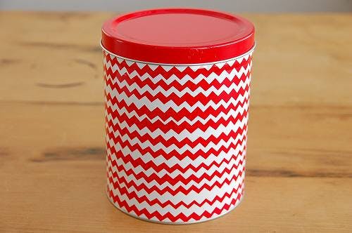 赤いギザギザ模様がとっても印象的なブリキ缶が届きました!
