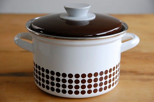 スウェーデンで見つけたドット模様が可愛らしい、ホーロー両手鍋です。