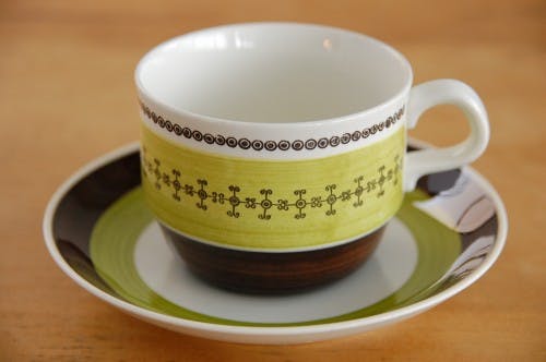 柔らかなグリーンとブラウンが織り成す模様は、落ち着きがありながらも、どこか華やかな雰囲気を放っています。こんな食器でティータイムを楽しめば、テーブルにパッと花が咲いたようになるのではないかと思いました。