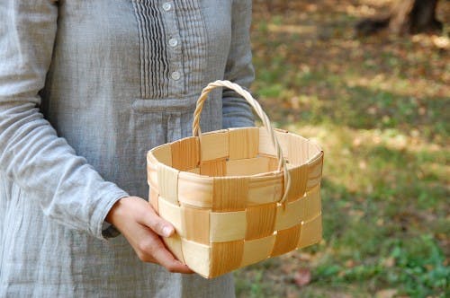 モミの木の樹皮を切り出し丁寧に編みこまれているので、手にした時の木肌の触感や香りはフィンランドの森に迷い込んだような気持ちにさせてくれます。