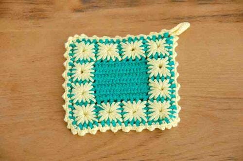 スウェーデンで見つけた手編みのポットマット(イエロー&グリーン、スクエア)です。