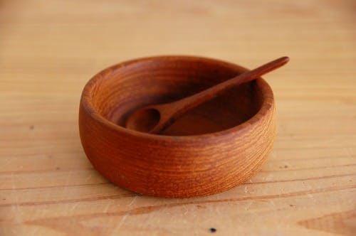 スウェーデンで見つけたチーク材でできた塩入れ(小さじ付き)です。