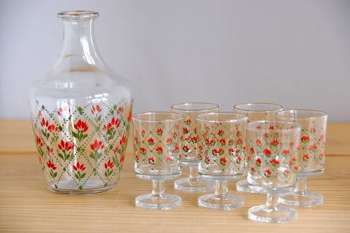 赤のお花模様がとってもキュート!ボトルとショットグラスがお揃いで見付かることはちょっと珍しいのではないでしょうか。