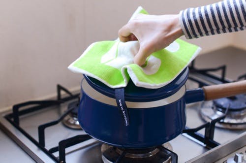 鍋やケトルの持ち手を掴む時はもちろん、鍋の蓋を持ち上げる時、熱々のお料理をオーブンから取り出す時、ティーポットを食卓に置く時、おやつとマグカップの下に敷いてティーマットとして。