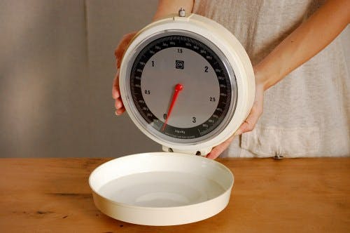 壁に短いビスなどを打って簡単に掛けられるようになっています。蓋の内側がそのまま量り台になっていますので、蓋を開けその上にボウルなどを置いて計量することが可能です。物を台の上にのせると、量り針が動きます。