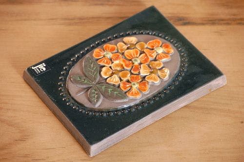 こちらの陶板もまた素敵です!どっしりとした素朴な陶器の質感の上に浮かび上がる可憐なオレンジのお花。本当にかっこよさと可愛らしさを兼ね揃えたJIEらしい作品です。