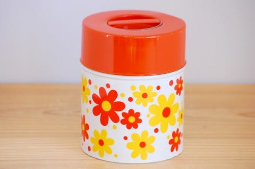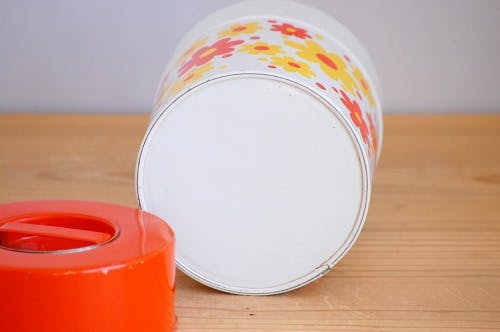 オレンジとイエローのお花が缶をグルリと彩るハッピーな雰囲気のブリキ缶です。また、レトロな雰囲気たっぷりで、どこか懐かしいようなほのぼのとした気持ちにさせてくれます。