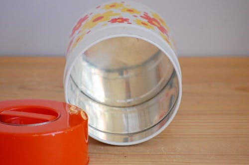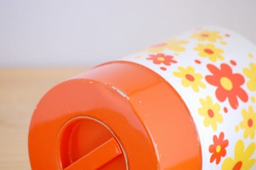 スウェーデンで見つけた古いブリキ缶(オレンジ・花柄)です。