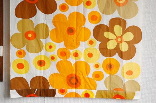 スウェーデンで見つけたオレンジ色のお花模様が可愛いカーテン(タペストリー)です。