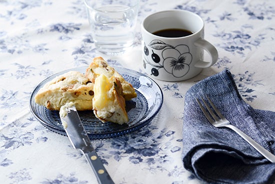 レインの深くて濃い青色は、しとしとと雨の降る空を見上げるようで、のせたものを魅力的に見せてくれる色味ですよ。