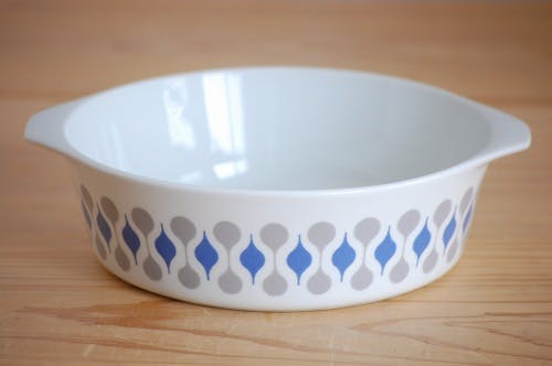 ブルーとグレーの組み合わせのシンプルな模様が北欧テイストたっぷりのこちらのキャセロール。北欧デザインの鍋つかみを合わせて使いたくなりますね。
