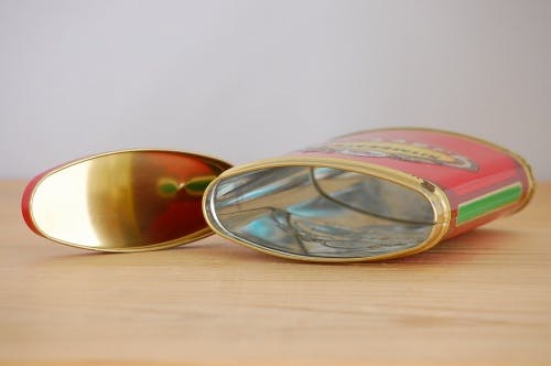 本体開口部に小さなメッキの剥がれが見られますが、缶の表面や内部は綺麗に保たれていますので、デスク周りで色鉛筆などの文具を入れるのに使ったり、キッチン周りで鷹の爪などのスパイス入れとして使っても良さそうです。