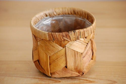 スウェーデンで見つけた木の皮で編まれた植木鉢カバーです。