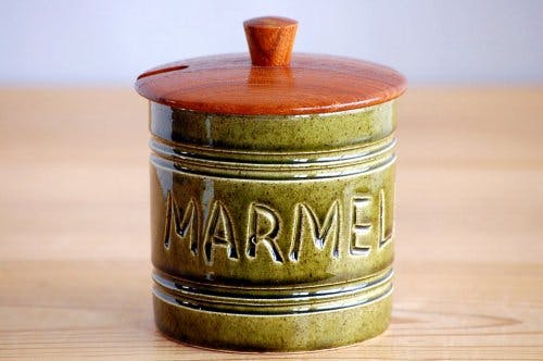 スウェーデンで見つけた木蓋付き陶器のマーマレードポットです。
