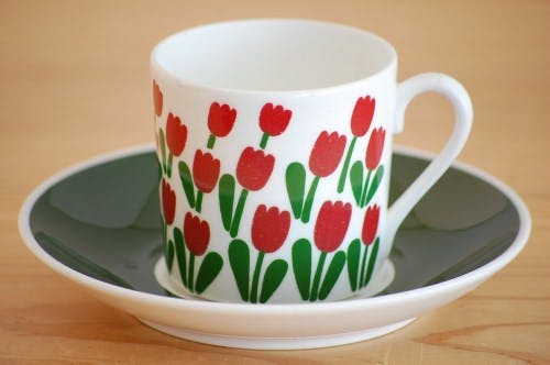 このJULIANAシリーズには、同じデザインでソーサーやチューリップのお色に何色かバリエーションがあるようです。今回入荷してきたのは、植物のイメージをそのまま感じることができるグリーンとレッドの魅力的な組み合わせです。