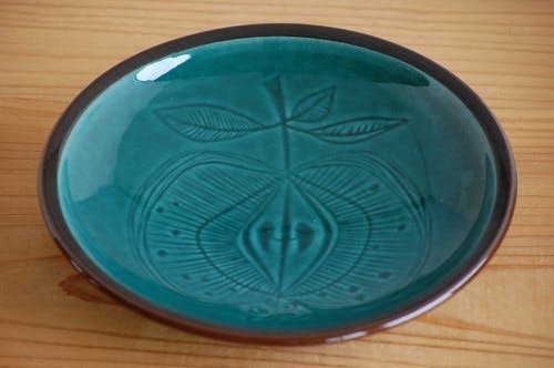 シックなグリーンのお色と、大きく描かれたリンゴの絵柄が美しいこちらのプレート。ブラウンの縁取りが全体を引き締めています。