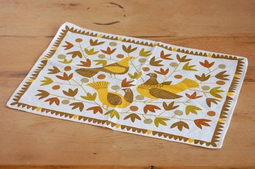 スウェーデンで見つけた黄色い鳥の絵柄が可愛いセンタークロスです。