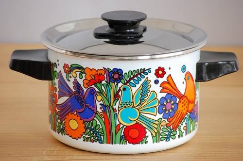スウェーデンで見つけた、ホーロー製の両手鍋(小鳥)です。