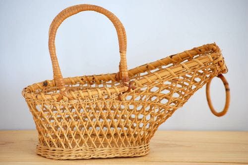 古いバスケットならではの良い風合いが魅力的です。籐で編まれたナチュラルな雰囲気のバスケットですので、ピクニックに連れていったらよく似合いそうだな~と想像しました。